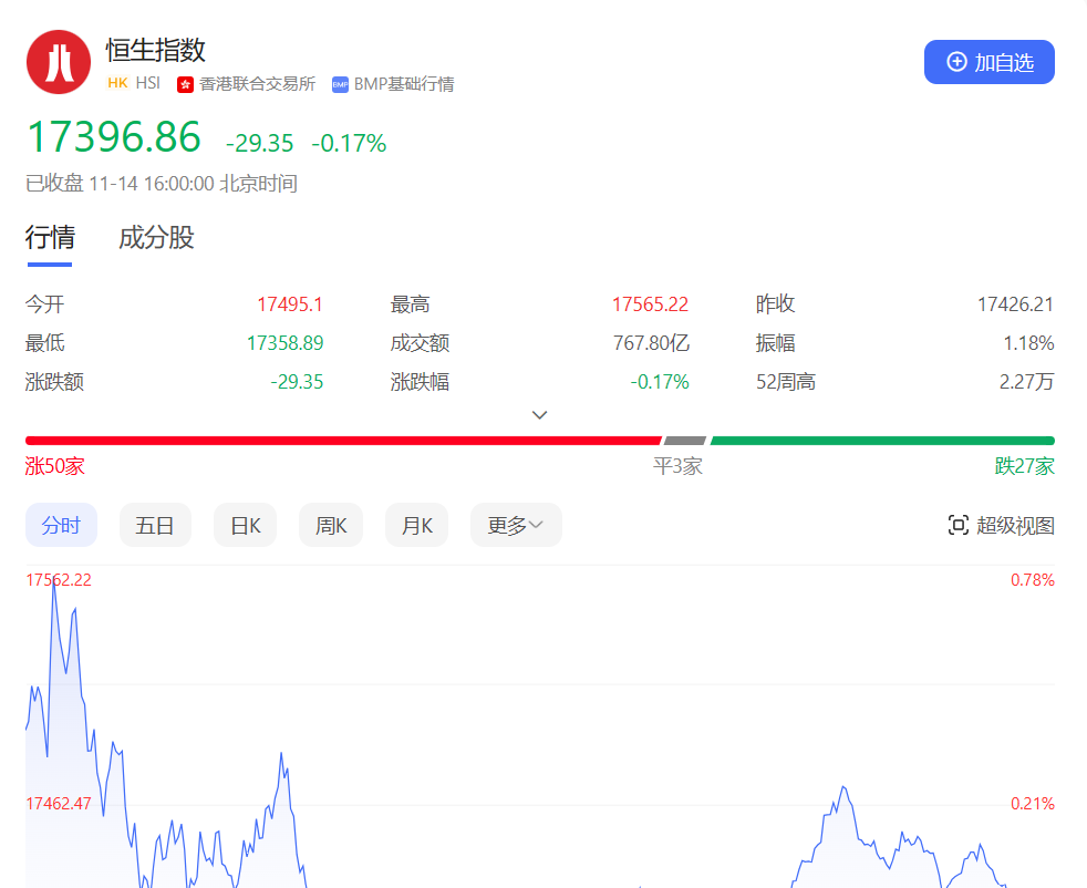 香港恒生指数开盘涨0.4%,三大指数早盘高开后快速下挫,随即翻绿走低,此后全天呈弱势震荡走势。截止收盘,恒生指数跌0.17%或29.35点,报17396.86点,全日成交额767.8亿港元;恒生国企指数跌0.41%,报5964.54点;恒生科技指数跌0.74%,报3951.75点。
