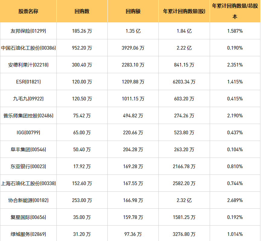 11月20日港股回购概况:摩比发展(00947)、新鸿基公司(00086)、安德利果汁(02218)、绿城服务(02869)、亚洲金融(00662)、东亚银行(00023)、首佳科技(00103)、亿胜生物科技(01061)、普乐师集团控股(02486)、友邦保险(01299)、九毛九(09922)、金利来集团(00533)、昊海生物科技(06826)、天福(06868)、金科服务(09666)、中国石油化工股份(00386)、上海石油化工股份(00338)、中国淀粉(03838)、思考乐教育(01769)、德银天下(02418)、中石化炼化工程(02386)、复星国际(00656)、归创通桥-B(02190)、赛晶科技(00580)、协合新能源(00182)、中电光谷(00798)、阜丰集团(00546)、ESR(01821)、IGG(00799)、康圣环球(09960)于2023年11月17日进行了回购。其中,回购金额最大的为友邦保险(01299),回购数量185.26 万,回购金额1.35 亿元。
