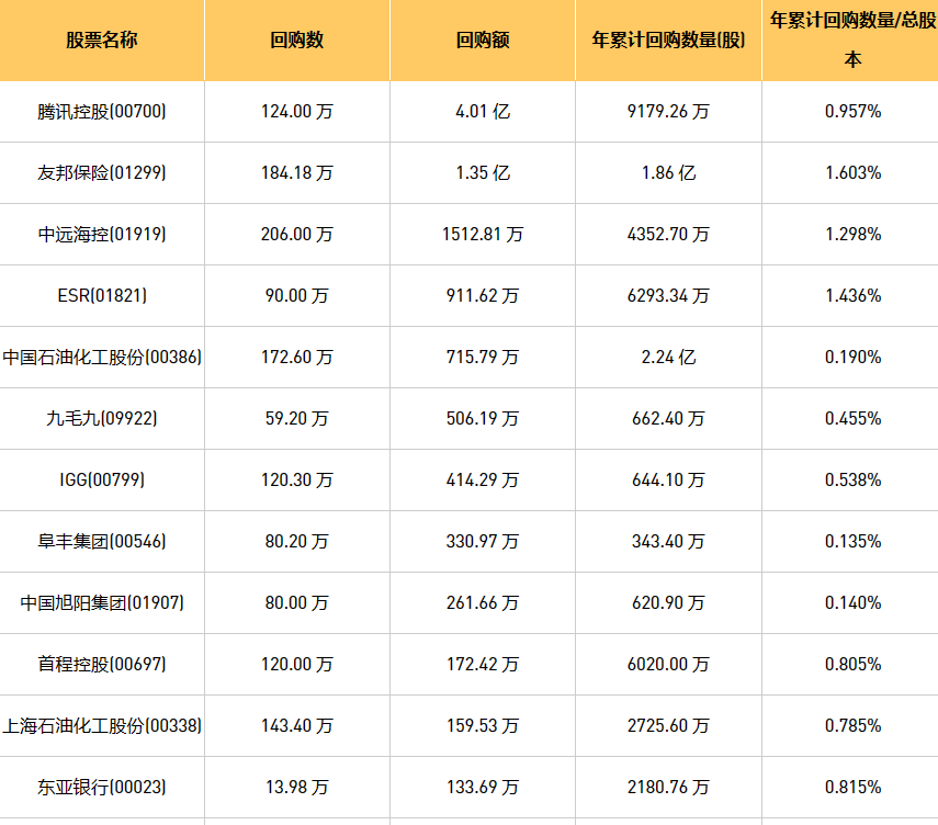 11月21日港股回购概况:摩比发展(00947)、安德利果汁(02218)、亿胜生物科技(01061)、清科创业(01945)、中国石油化工股份(00386)、首佳科技(00103)、中国淀粉(03838)、九毛九(09922)、友邦保险(01299)、东亚银行(00023)、未来发展控股(01259)、天福(06868)、科联系统(00046)、昊海生物科技(06826)、金科服务(09666)、绿城服务(02869)、腾讯控股(00700)、上海石油化工股份(00338)、金利来集团(00533)、归创通桥-B(02190)、首程控股(00697)、思考乐教育(01769)、歌礼制药-B(01672)、旭日企业(00393)、新鸿基公司(00086)、IGG(00799)、中国旭阳集团(01907)、中远海控(0)、德银天下(02418)、ESR(01821)、创胜集团-B(06628)、中电光谷(00798)、协合新能源(00182)、康圣环球(09960)、阜丰集团(00546)于2023年11月20日进行了回购。其中,回购金额最大的为腾讯控股(00700),回购数量124.00 万,回购金额4.01 亿元。