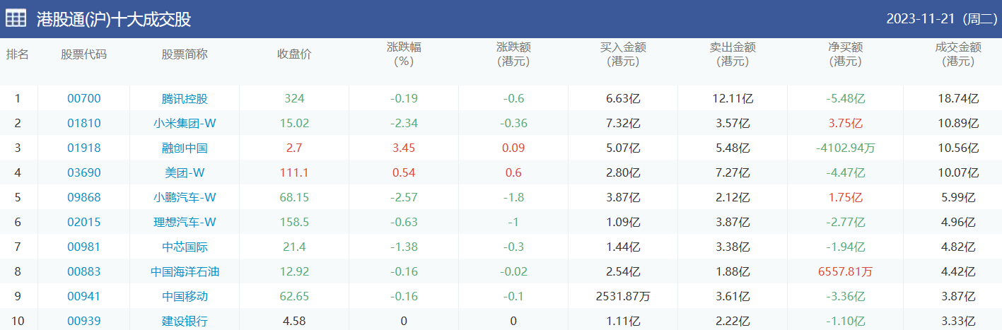 亚汇网实时数据统计:截至11月22日收盘,腾讯控股、小米集团-w、融创中国位居港股通(沪)成交前三,腾讯控股、小米集团-w、融创中国位居股通(深)成交前三。