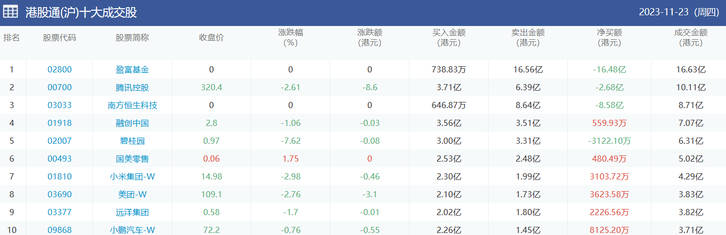 亚汇网实时数据统计:截至11月24日收盘,盈富基金、腾讯控股、南方恒生科技位居港股通(沪)成交前三,盈富基金、恒生中国企业、腾讯控股位居股通(深)成交前三。