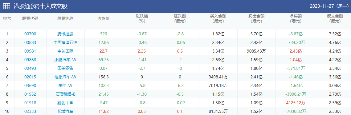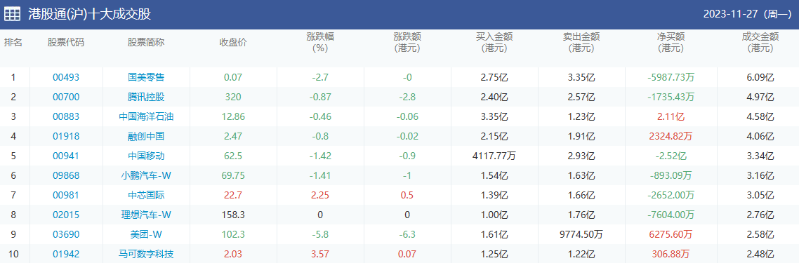 亚汇网实时数据统计:截至11月28日收盘,国美零售、腾讯控股、中国海洋石油位居港股通(沪)成交前三,腾讯控股、中国海洋石油、中芯国际位居股通(深)成交前三。