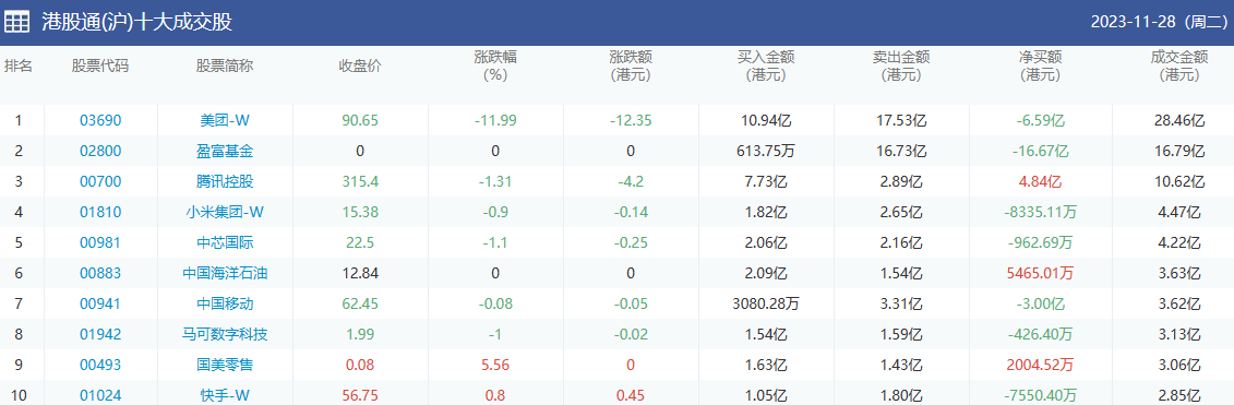 亚汇网实时数据统计:截至11月29日收盘,美团-w、盈富基金、腾讯控股位居港股通(沪)成交前三,美团-w、盈富基金、恒生中国企业位居股通(深)成交前三。