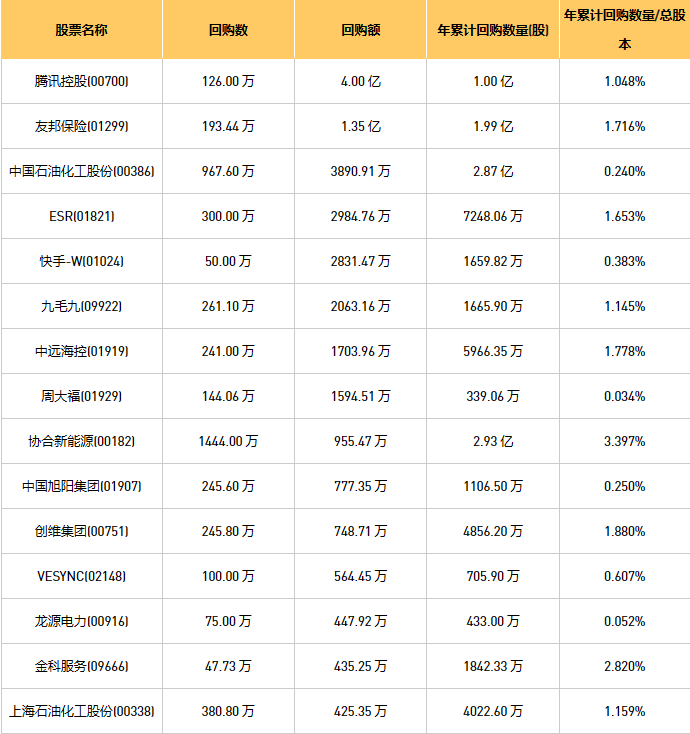 11月30日港股回购概况:中国淀粉(03838)、摩比发展(00947)、新鸿基公司(00086)、旭辉永升服务(01995)、互太纺织(01382)、创维集团(00751)、金科服务(09666)、金利来集团(00533)、九毛九(09922)、亚洲联合基建控股(00711)、亿胜生物科技(01061)、东亚银行(00023)、天福(06868)、首佳科技(00103)、友邦保险(01299)、上海石油化工股份(00338)、微泰医疗-B(02235)、中石化炼化工程(02386)、腾讯控股(00700)、中国石油化工股份(00386)、绿城服务(02869)、首程控股(00697)、龙源电力(00916)、中远海控(0)、周大福(01929)、美因基因(06667)、彩客新能源(01986)、VESYNC(02148)、歌礼制药-B(01672)、中国旭阳集团(01907)、复星国际(00656)、旭日企业(00393)、赛晶科技(00580)、数码通电讯(00315)、ESR(01821)、快手-W(01024)、汇量科技(01860)、飞天云动(06610)、阜丰集团(00546)、亿都(国际控股)(00259)、IGG(00799)、中电光谷(00798)、海伦司(09869)、香港科技探索(01137)、福森药业(01652)、协合新能源(00182)、康圣环球(09960)于2023年11月29日进行了回购。其中,回购金额最大的为腾讯控股(00700),回购数量126.00 万,回购金额4.00 亿元。