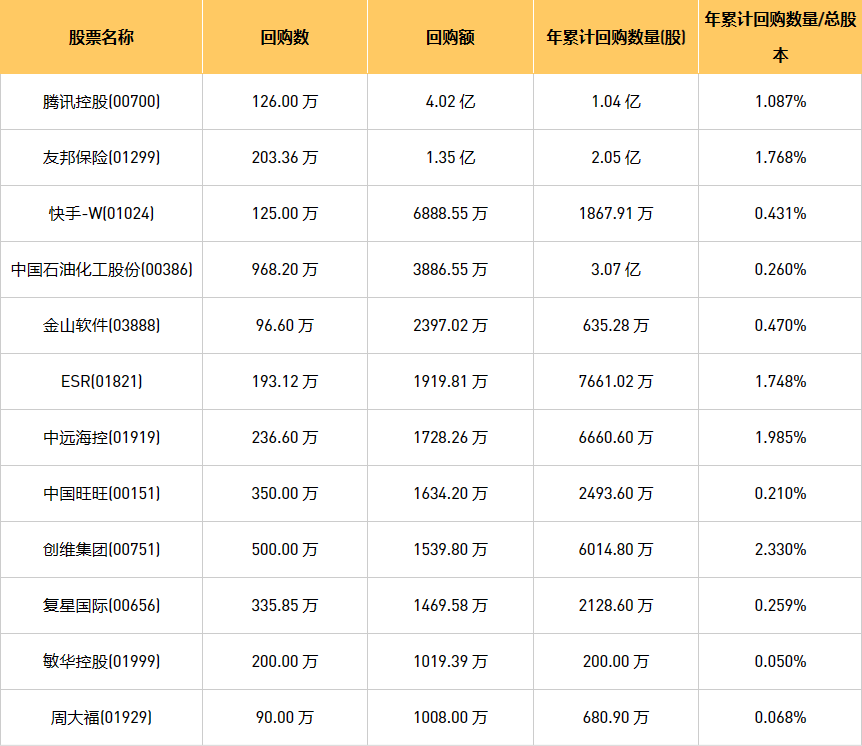 12月5日港股回购概况:旭辉永升服务(01995)、摩比发展(00947)、伟仕佳杰(00856)、永安国际(00289)、科联系统(00046)、亿胜生物科技(01061)、创维集团(00751)、周大福(01929)、金利来集团(00533)、天福(06868)、东亚银行(00023)、中远海控(0)、中裕能源(03633)、昊海生物科技(06826)、互太纺织(01382)、富智康集团(02038)、金科服务(09666)、绿城服务(02869)、赛晶科技(00580)、中国淀粉(03838)、先声药业(02096)、歌礼制药-B(01672)、友邦保险(01299)、中国旺旺(00151)、首佳科技(00103)、亿都(国际控股)(00259)、腾讯控股(00700)、彩客新能源(01986)、上海石油化工股份(00338)、中石化炼化工程(02386)、VESYNC(02148)、复星国际(00656)、盛龙锦秀国际(08481)、新鸿基公司(00086)、微泰医疗-B(02235)、百融云-W(06608)、天鸽互动(01980)、中国石油化工股份(00386)、首程控股(00697)、旭日企业(00393)、龙源电力(00916)、民银资本(01141)、IGG(00799)、天立国际控股(01773)、金山软件(03888)、协合新能源(00182)、快手-W(01024)、汇量科技(01860)、ESR(01821)、敏华控股(01999)、康圣环球(09960)、海伦司(09869)、顺丰同城(09699)、香港科技探索(01137)、阜丰集团(00546)、中电光谷(00798)于2023年12月4日进行了回购。其中,回购金额最大的为腾讯控股(00700),回购数量126.00 万,回购金额4.02 亿元。