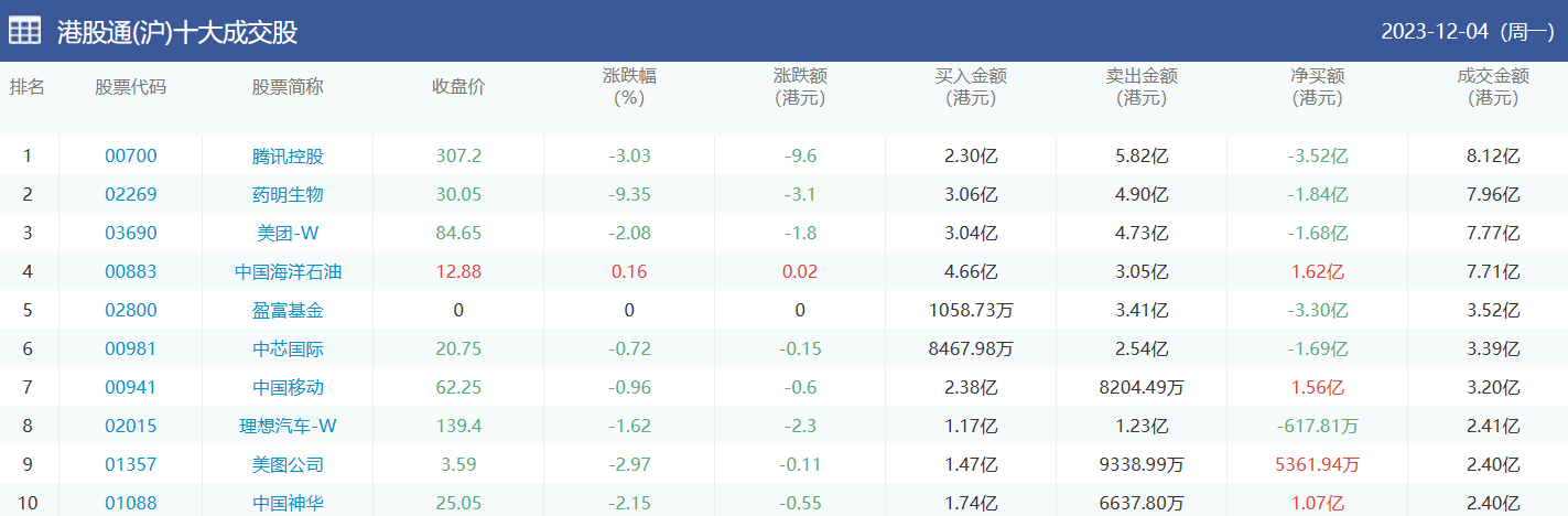 亚汇网实时数据统计:截至12月5日收盘,腾讯控股、药明生物、美团-w位居港股通(沪)成交前三,药明生物、美团-w、腾讯控股位居股通(深)成交前三。