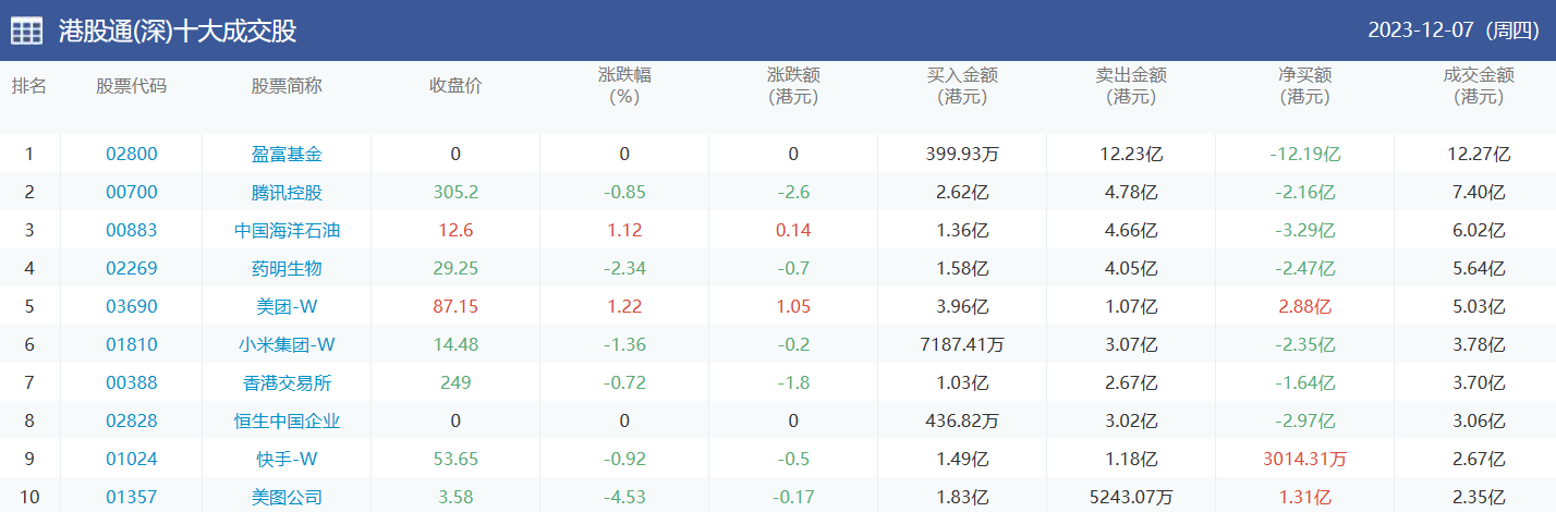 亚汇网实时数据统计:截至12月8日收盘,中国海洋石油、美团-w、恒生中国企业位居港股通(沪)成交前三,盈富基金、腾讯控股、中国海洋石油位居股通(深)成交前三。