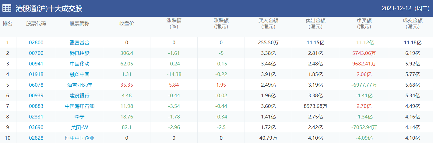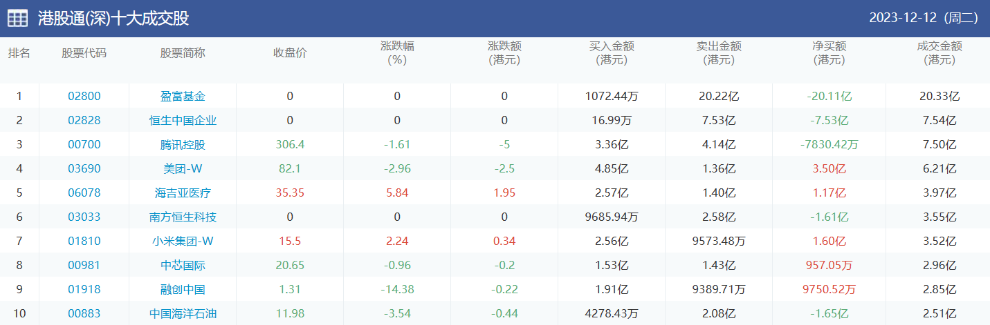 亚汇网实时数据统计:截至12月13日收盘,盈富基金、腾讯控股、中国移动位居港股通(沪)成交前三,盈富基金、恒生中国企业、腾讯控股位居股通(深)成交前三。