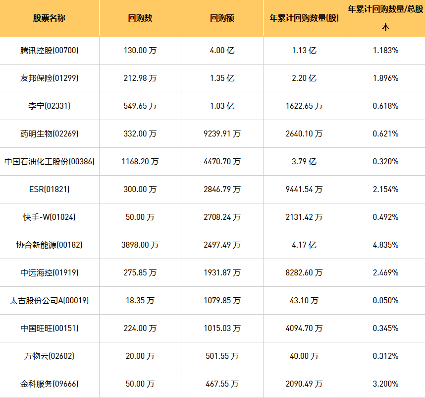 12月14日港股回购概况:旭辉永升服务(01995)、摩比发展(00947)、金利来集团(00533)、科联系统(00046)、伟仕佳杰(00856)、绿城服务(02869)、中国淀粉(03838)、中国石油化工股份(00386)、中远海控(0)、创维集团(00751)、东亚银行(00023)、清科创业(01945)、微泰医疗-B(02235)、中国旺旺(00151)、彩客新能源(01986)、天鸽互动(01980)、昊海生物科技(06826)、盛龙锦秀国际(08481)、上海石油化工股份(00338)、歌礼制药-B(01672)、太古股份公司B(00087)、中裕能源(03633)、泡泡玛特(09992)、金科服务(09666)、太古股份公司A(00019)、友邦保险(01299)、归创通桥-B(02190)、李宁(02331)、旭日企业(00393)、复星国际(00656)、邝文记(08023)、协合新能源(00182)、亿都(国际控股)(00259)、赛晶科技(00580)、IGG(00799)、VESYNC(02148)、美因基因(06667)、首程控股(00697)、汇量科技(01860)、ESR(01821)、快手-W(01024)、联康生物科技集团(00690)、天立国际控股(01773)、欧康维视生物-B(01477)、康圣环球(09960)、中电光谷(00798)、阜丰集团(00546)、万物云(02602)、德银天下(02418)、药明生物(02269)、腾讯控股(00700)于2023年12月13日进行了回购。其中,回购金额最大的为腾讯控股(00700),回购数量130.00 万,回购金额4.00 亿元。