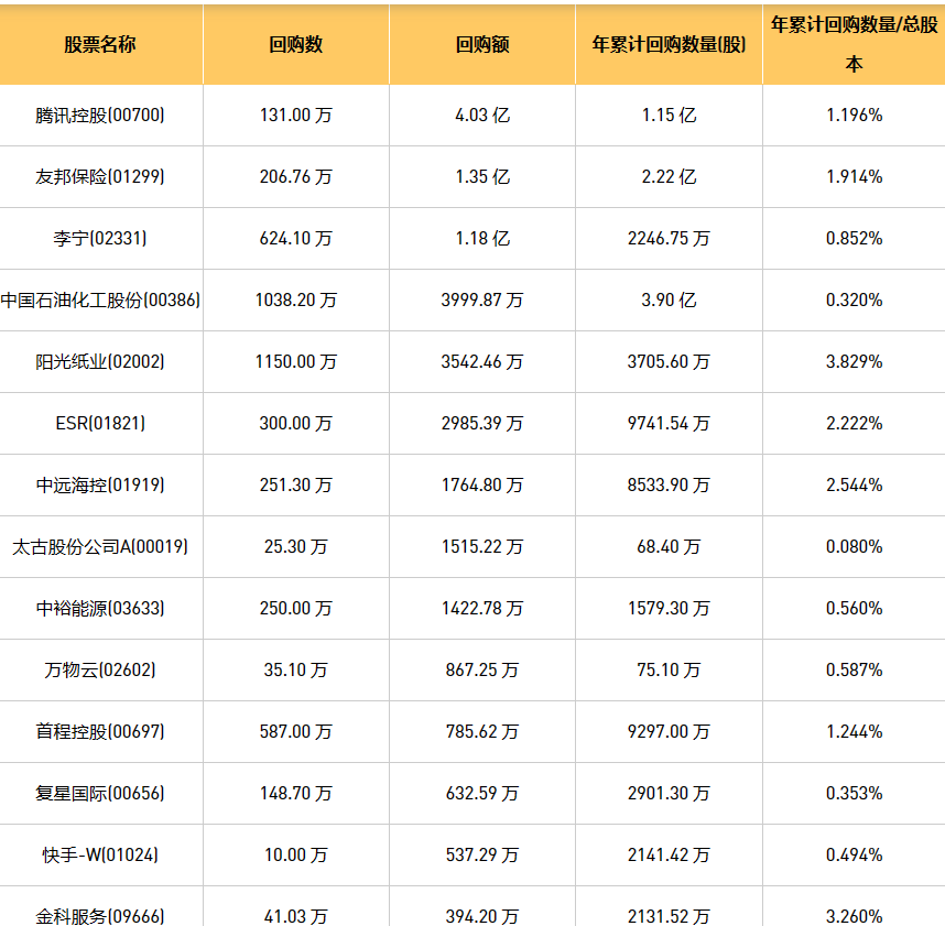 12月15日港股回购概况:摩比发展(00947)、旭辉永升服务(01995)、金利来集团(00533)、东亚银行(00023)、阳光纸业(02002)、绿城服务(02869)、亚洲金融(00662)、泡泡玛特(09992)、理文造纸(02314)、李宁(02331)、中国旺旺(00151)、中国石油化工股份(00386)、东风集团股份(00489)、太古股份公司B(00087)、腾讯控股(00700)、太古股份公司A(00019)、昊海生物科技(06826)、德银天下(02418)、金科服务(09666)、中远海控(0)、友邦保险(01299)、盛龙锦秀国际(08481)、亿都(国际控股)(00259)、中石化炼化工程(02386)、复星国际(00656)、普乐师集团控股(02486)、美因基因(06667)、天鸽互动(01980)、中国淀粉(03838)、中裕能源(03633)、富智康集团(02038)、上海石油化工股份(00338)、首程控股(00697)、歌礼制药-B(01672)、IGG(00799)、欧康维视生物-B(01477)、旭日企业(00393)、顺丰同城(09699)、协合新能源(00182)、中电光谷(00798)、联康生物科技集团(00690)、汇量科技(01860)、ESR(01821)、首惠产业金融(00730)、天立国际控股(01773)、金山软件(03888)、快手-W(01024)、万物云(02602)、康圣环球(09960)、福森药业(01652)于2023年12月14日进行了回购。其中,回购金额最大的为腾讯控股(00700),回购数量131.00 万,回购金额4.03 亿元。