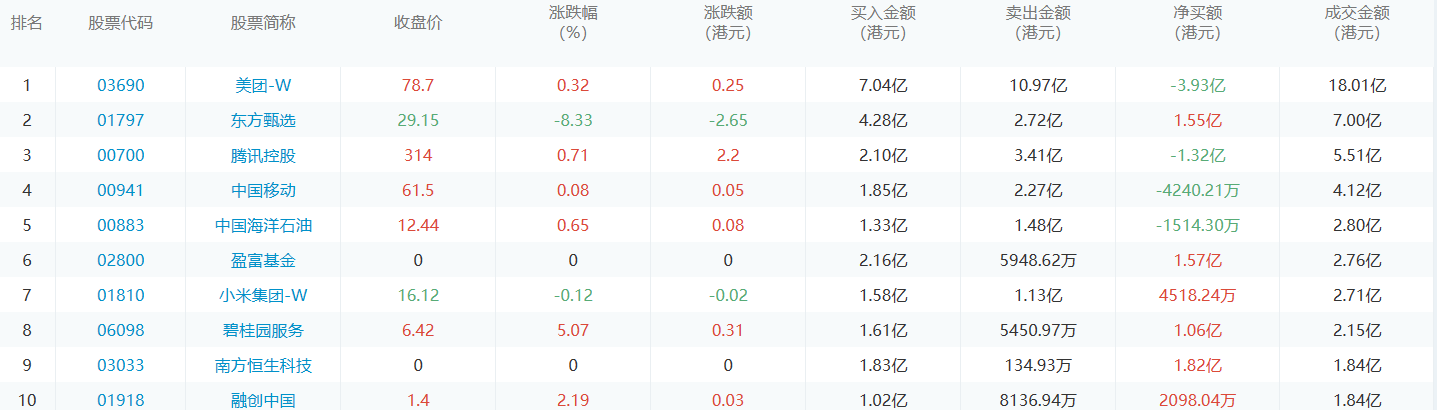 亚汇网12月20日港股通数据统计显示:美团-w净买入额居首,达7.04亿港元,美团-w净卖出额居第一位。