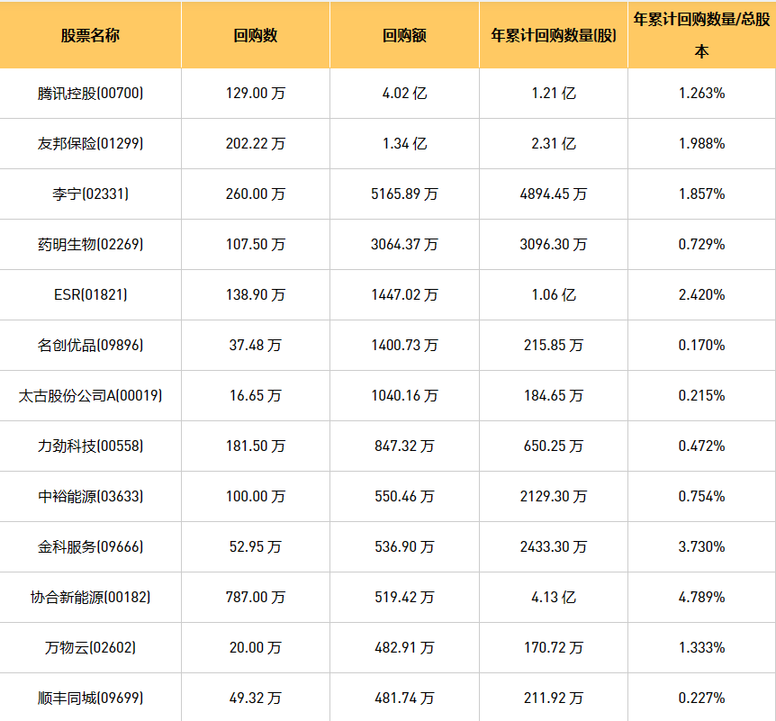12月22日港股回购概况:名创优品(09896)、青岛啤酒股份(00168)、富智康集团(02038)、摩比发展(00947)、微泰医疗-B(02235)、旭辉永升服务(01995)、创维集团(00751)、李宁(02331)、津上机床中国(01651)、金科服务(09666)、新鸿基公司(00086)、东亚银行(00023)、上海石油化工股份(00338)、中远海控(0)、腾讯控股(00700)、归创通桥-B(02190)、首佳科技(00103)、天福(06868)、首程控股(00697)、歌礼制药-B(01672)、阳光纸业(02002)、亿都(国际控股)(00259)、先声药业(02096)、太古股份公司B(00087)、龙源电力(00916)、友邦保险(01299)、美因基因(06667)、太古股份公司A(00019)、旭日企业(00393)、民银资本(01141)、力劲科技(00558)、清科创业(01945)、中裕能源(03633)、天鸽互动(01980)、VESYNC(02148)、复星国际(00656)、首惠产业金融(00730)、顺丰同城(09699)、天立国际控股(01773)、ESR(01821)、汇量科技(01860)、阜丰集团(00546)、联康生物科技集团(00690)、德银天下(02418)、中石化炼化工程(02386)、协合新能源(00182)、IGG(00799)、万物云(02602)、星盛商业(06668)、快手-W(01024)、中电光谷(00798)、药明生物(02269)、康圣环球(09960)、金阳新能源(01121)、福森药业(01652)于2023年12月21日进行了回购。其中,回购金额最大的为腾讯控股(00700),回购数量129.00 万,回购金额4.02 亿元。
