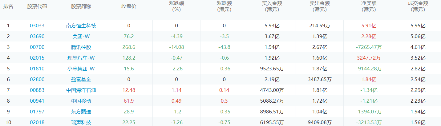 亚汇网12月22日港股通数据统计显示:南方恒生科技净买入额居首,达5.93亿港元,腾讯控股净卖出额居第一位。