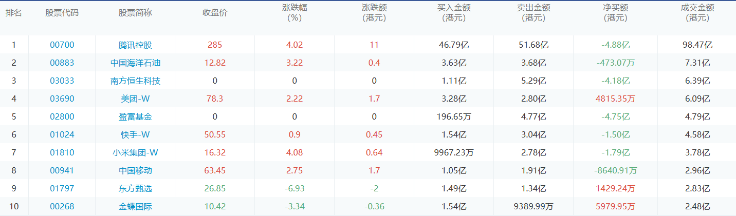 亚汇网12月27日港股通数据统计显示:腾讯控股净买入额居首,达46.79亿港元,腾讯控股净卖出额居第一位。