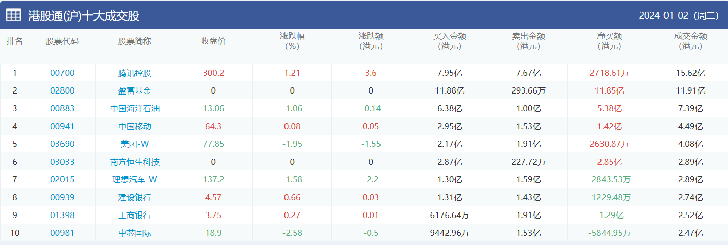 亚汇网实时数据统计:截至1月3日收盘腾讯控股、盈富基金、中国海洋石油位居港股通(沪)成交前三,腾讯控股、中国海洋石油、美团-w位居股通(深)成交前三。
