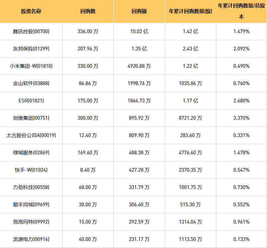 1月4日港股回购概况:创维集团(00751)、旭辉永升服务(01995)、亿胜生物科技(01061)、富智康集团(02038)、上实城市开发(00563)、龙源电力(00916)、百宏实业(02299)、天福(06868)、绿城服务(02869)、清科创业(01945)、腾讯控股(00700)、泡泡玛特(09992)、科联系统(00046)、首程控股(00697)、友邦保险(01299)、亿都(国际控股)(00259)、力劲科技(00558)、北控城市资源(03718)、汇量科技(01860)、上海石油化工股份(00338)、天鸽互动(01980)、赛晶科技(00580)、VESYNC(02148)、首惠产业金融(00730)、太古股份公司A(00019)、太古股份公司B(00087)、微泰医疗-B(02235)、联康生物科技集团(00690)、方达控股(01521)、旭日企业(00393)、顺丰同城(09699)、IGG(00799)、天立国际控股(01773)、快手-W(01024)、康基医疗(09997)、金山软件(03888)、欧康维视生物-B(01477)、ESR(01821)、德银天下(02418)、小米集团-W(01810)、瑞尔集团(06639)、康圣环球(09960)于2024年1月3日进行了回购。其中,回购金额最大的为腾讯控股(00700),回购数量336.00 万,回购金额10.02 亿元。
