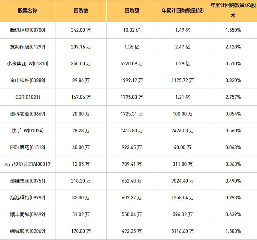 1月8日港股回购概况:摩比发展(00947)、上实城市开发(00563)、富智康集团(02038)、永安国际(00289)、旭辉永升服务(01995)、科联系统(00046)、龙源电力(00916)、天福(06868)、绿城服务(02869)、微泰医疗-B(02235)、腾讯控股(00700)、首程控股(00697)、清科创业(01945)、创维集团(00751)、北控城市资源(03718)、泡泡玛特(09992)、赛晶科技(00580)、友邦保险(01299)、汇量科技(01860)、歌礼制药-B(01672)、德银天下(02418)、亿都(国际控股)(00259)、力劲科技(00558)、上海石油化工股份(00338)、太古股份公司A(00019)、创科实业(00669)、天立国际控股(01773)、旭日企业(00393)、太古股份公司B(00087)、联康生物科技集团(00690)、金山软件(03888)、欧康维视生物-B(01477)、快手-W(01024)、ESR(01821)、首惠产业金融(00730)、小米集团-W(01810)、顺丰同城(09699)、未来发展控股(01259)、康圣环球(09960)、康基医疗(09997)、丽珠医药(01513)于2024年1月5日进行了回购。其中,回购金额最大的为腾讯控股(00700),回购数量342.00 万,回购金额10.02 亿元。