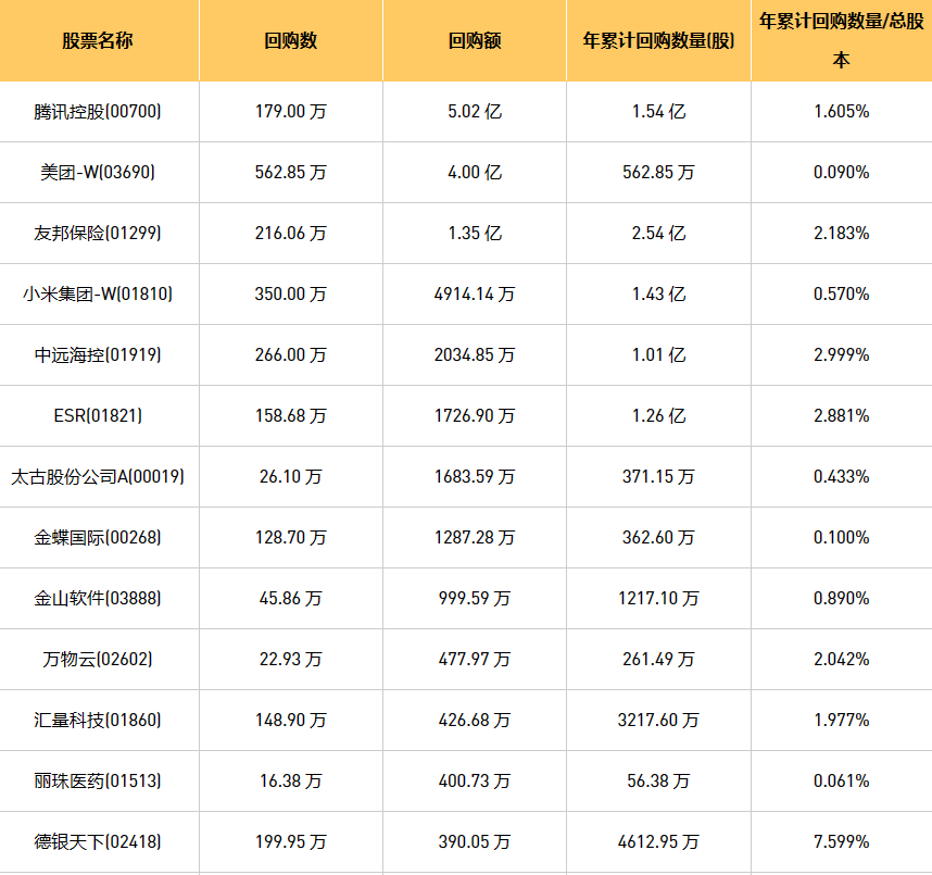 1月11日港股回购概况:北控城市资源(03718)、亿胜生物科技(01061)、上实城市开发(00563)、未来发展控股(01259)、天福(06868)、龙源电力(00916)、上海石油化工股份(00338)、创维集团(00751)、绿城服务(02869)、理文造纸(02314)、旭辉永升服务(01995)、中远海控(0)、赛晶科技(00580)、金蝶国际(00268)、立基工程控股(01690)、腾讯控股(00700)、IGG(00799)、友邦保险(01299)、联康生物科技集团(00690)、首程控股(00697)、复星国际(00656)、金山软件(03888)、旭日企业(00393)、歌礼制药-B(01672)、ESR(01821)、天鸽互动(01980)、欧康维视生物-B(01477)、德银天下(02418)、首惠产业金融(00730)、亿都(国际控股)(00259)、万物云(02602)、太古股份公司A(00019)、快手-W(01024)、小米集团-W(01810)、太古股份公司B(00087)、天立国际控股(01773)、康基医疗(09997)、汇量科技(01860)、力劲科技(00558)、康圣环球(09960)、美团-W(03690)、顺丰同城(09699)、丽珠医药(01513)于2024年1月10日进行了回购。其中,回购金额最大的为腾讯控股(00700),回购数量179.00 万,回购金额5.02 亿元。
