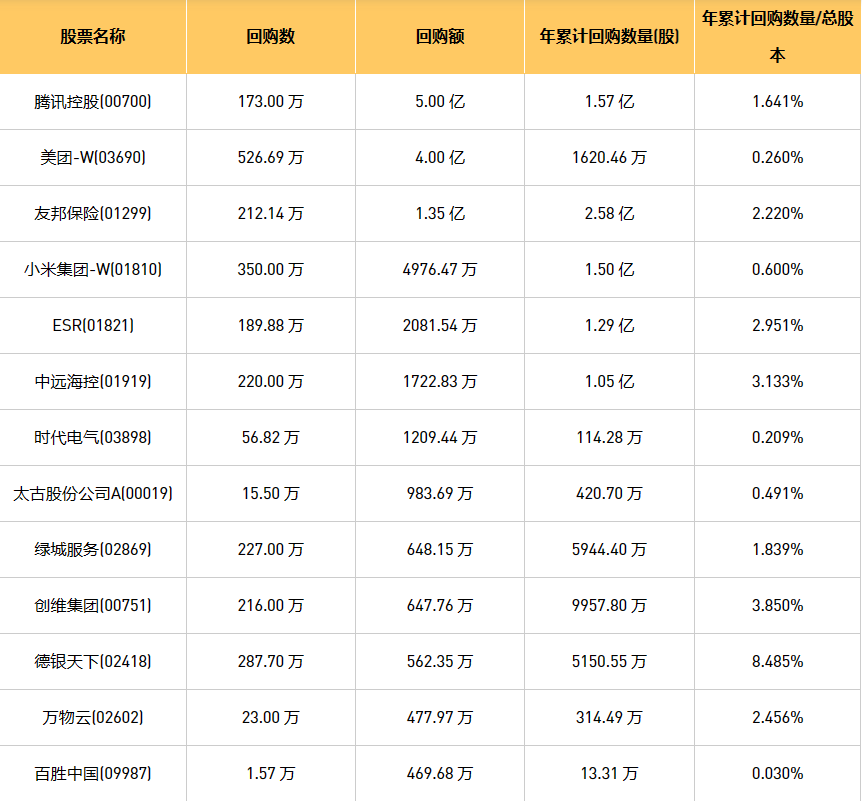 1月15日港股回购概况:创维集团(00751)、摩比发展(00947)、永安国际(00289)、旭辉永升服务(01995)、力劲科技(00558)、时代电气(03898)、上实城市开发(00563)、龙源电力(00916)、理文造纸(02314)、中国星集团(00326)、汇量科技(01860)、北控城市资源(03718)、思考乐教育(01769)、中远海控(0)、赛晶科技(00580)、腾讯控股(00700)、首程控股(00697)、微泰医疗-B(02235)、太古股份公司A(00019)、IGG(00799)、亿都(国际控股)(00259)、彩客新能源(01986)、上海石油化工股份(00338)、绿城服务(02869)、歌礼制药-B(01672)、ESR(01821)、联康生物科技集团(00690)、友邦保险(01299)、欧康维视生物-B(01477)、亚洲联网科技(00679)、太古股份公司B(00087)、美团-W(03690)、先声药业(02096)、天鸽互动(01980)、康圣环球(09960)、旭日企业(00393)、万物云(02602)、美亨实业(01897)、星盛商业(06668)、首惠产业金融(00730)、德银天下(02418)、小米集团-W(01810)、顺丰同城(09699)、康基医疗(09997)、诺诚健华(09969)、百胜中国(09987)于2024年1月12日进行了回购。其中,回购金额最大的为腾讯控股(00700),回购数量173.00 万,回购金额5.00 亿元。