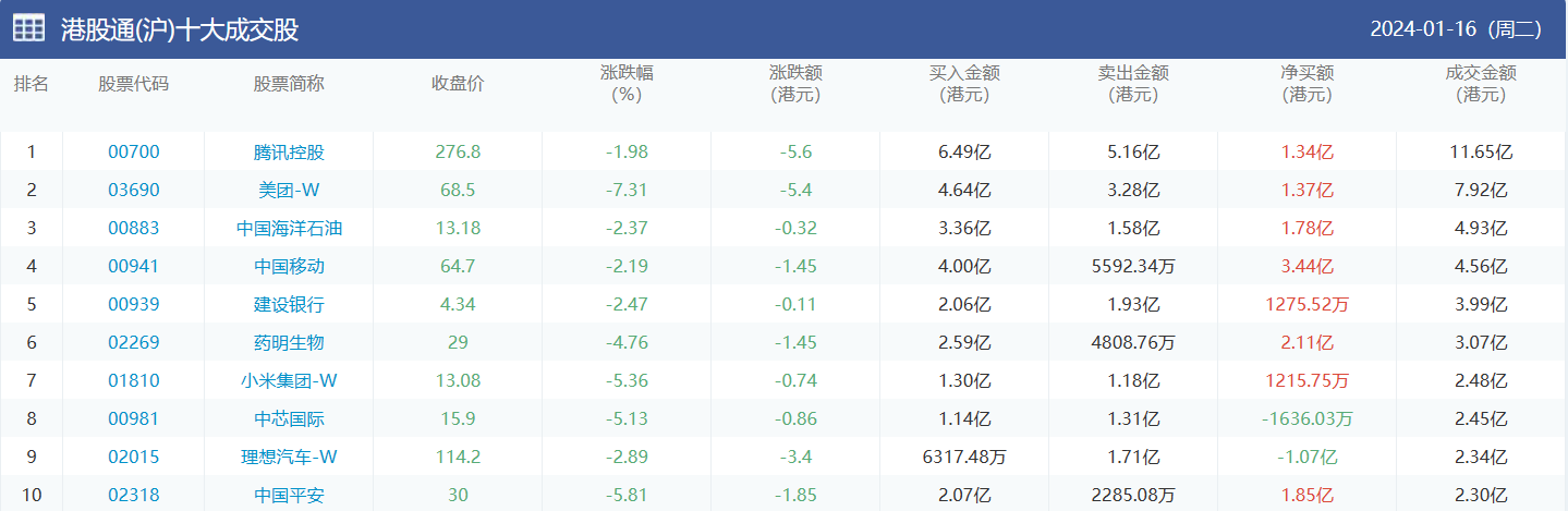 亚汇网实时数据统计:截至1月17日收盘腾讯控股、美团-w、中国海洋石油位居港股通(沪)成交前三,腾讯控股、美团-w、中国海洋石油位居股通(深)成交前三。