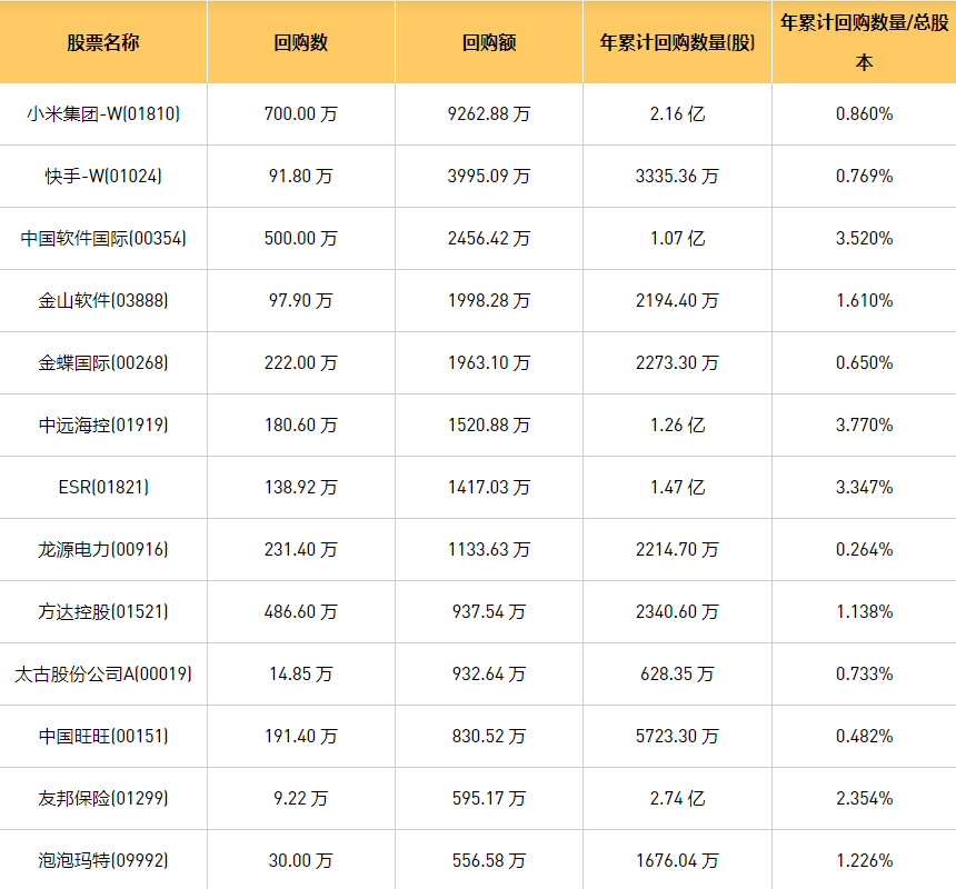1月29日港股回购概况:永安国际(00289)、中国软件国际(00354)、泡泡玛特(09992)、理文造纸(02314)、龙源电力(00916)、清科创业(01945)、中国旺旺(00151)、中远海控(0)、未来发展控股(01259)、奈雪的茶(02150)、友邦保险(01299)、上海石油化工股份(00338)、民银资本(01141)、太古股份公司A(00019)、祖龙娱乐(09990)、瑞尔集团(06639)、金蝶国际(00268)、歌礼制药-B(01672)、雍禾医疗(02279)、太古股份公司B(00087)、金山软件(03888)、丽珠医药(01513)、天鸽互动(01980)、旭日企业(00393)、小米集团-W(01810)、天立国际控股(01773)、汇量科技(01860)、快手-W(01024)、方达控股(01521)、ESR(01821)、福森药业(01652)、康圣环球(09960)、微泰医疗-B(02235)、百胜中国(09987)、立基工程控股(01690)、名创优品(09896)于2024年1月26日进行了回购。其中,回购金额最大的为小米集团-W(01810),回购数量700.00 万,回购金额9262.88 万元。
