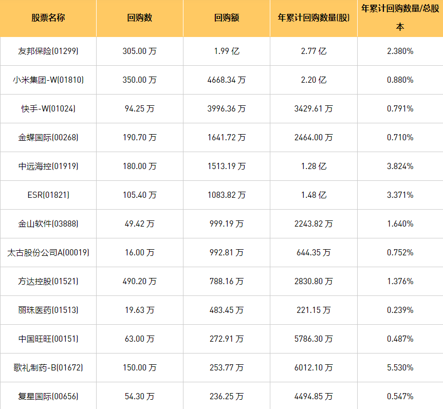1月30日港股回购概况:理文造纸(02314)、金蝶国际(00268)、上海石油化工股份(00338)、友邦保险(01299)、中远海控(0)、歌礼制药-B(01672)、中国旺旺(00151)、丽珠医药(01513)、复星国际(00656)、清科创业(01945)、首程控股(00697)、太古股份公司A(00019)、太古股份公司B(00087)、立基工程控股(01690)、旭日企业(00393)、美因基因(06667)、天立国际控股(01773)、方达控股(01521)、美亨实业(01897)、乐声电子(00213)、天鸽互动(01980)、汇量科技(01860)、ESR(01821)、小米集团-W(01810)、金山软件(03888)、快手-W(01024)、瑞尔集团(06639)于2024年1月29日进行了回购。其中,回购金额最大的为友邦保险(01299),回购数量305.00 万,回购金额1.99 亿元。