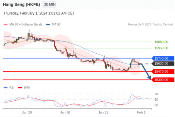 交易策略: 在 15740.00 之下,看跌,目标价位为 15470.00 ,然后为 15300.00 。