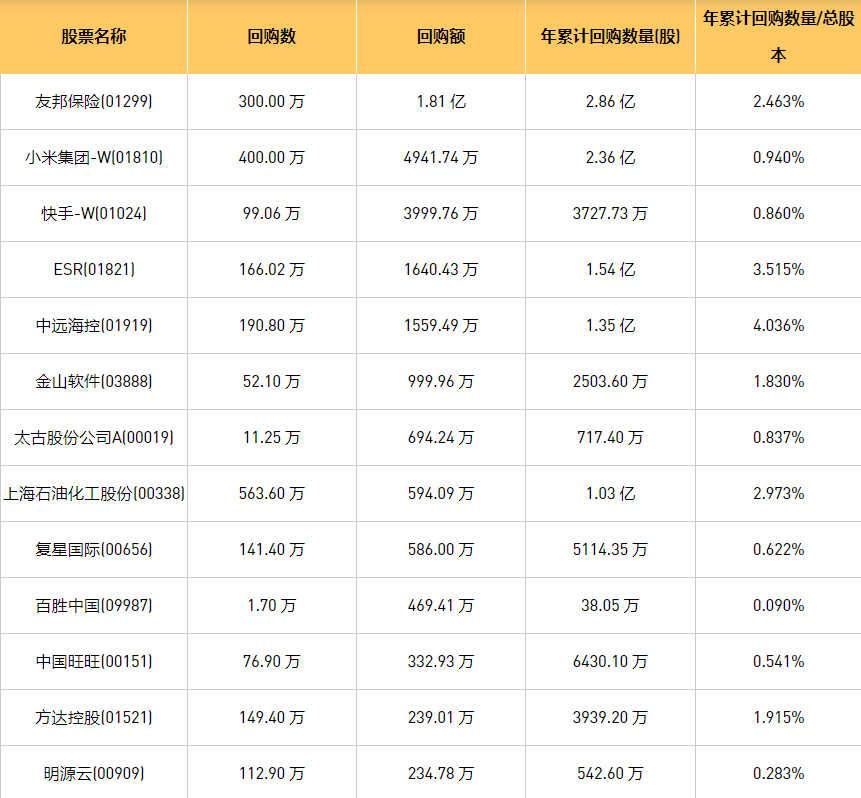 2月5日港股回购概况:中国旭阳集团(01907)、中远海控(0)、清科创业(01945)、微泰医疗-B(02235)、上海石油化工股份(00338)、友邦保险(01299)、中国旺旺(00151)、首程控股(00697)、歌礼制药-B(01672)、复星国际(00656)、天鸽互动(01980)、美因基因(06667)、太古股份公司A(00019)、美亨实业(01897)、金山软件(03888)、明源云(00909)、太古股份公司B(00087)、方达控股(01521)、天立国际控股(01773)、快手-W(01024)、小米集团-W(01810)、易点云(02416)、汇量科技(01860)、旭日企业(00393)、ESR(01821)、乐声电子(00213)、立基工程控股(01690)、金蝶国际(00268)、百胜中国(09987)于2024年2月2日进行了回购。其中,回购金额最大的为友邦保险(01299),回购数量300.00 万,回购金额1.81 亿元。