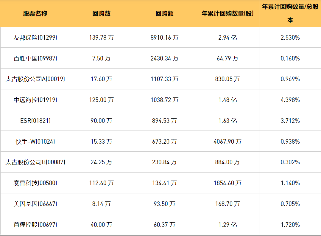 2月19日港股回购概况:资本策略地产(00497)、中远海控(0)、赛晶科技(00580)、首程控股(00697)、立基工程控股(01690)、ESR(01821)、友邦保险(01299)、歌礼制药-B(01672)、快手-W(01024)、微泰医疗-B(02235)、太古股份公司A(00019)、太古股份公司B(00087)、美因基因(06667)、百胜中国(09987)于2024年2月16日进行了回购。其中,回购金额最大的为友邦保险(01299),回购数量139.78 万,回购金额8910.16 万元。