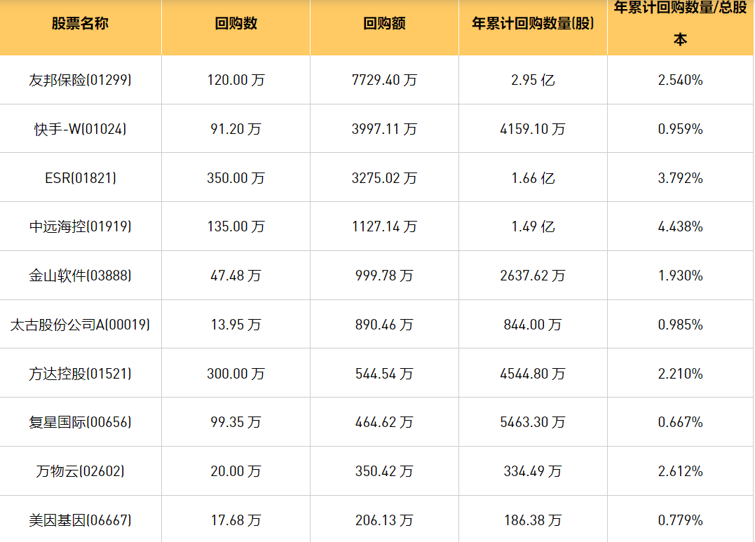2月20日港股回购概况:永安国际(00289)、中远海控(0)、友和集团(02347)、友邦保险(01299)、首程控股(00697)、金山软件(03888)、微泰医疗-B(02235)、复星国际(00656)、百融云-W(06608)、天鸽互动(01980)、太古股份公司A(00019)、歌礼制药-B(01672)、盛业(06069)、太古股份公司B(00087)、ESR(01821)、快手-W(01024)、方达控股(01521)、美因基因(06667)、赛晶科技(00580)、万物云(02602)于2024年2月19日进行了回购。其中,回购金额最大的为友邦保险(01299),回购数量120.00 万,回购金额7729.40 万元。