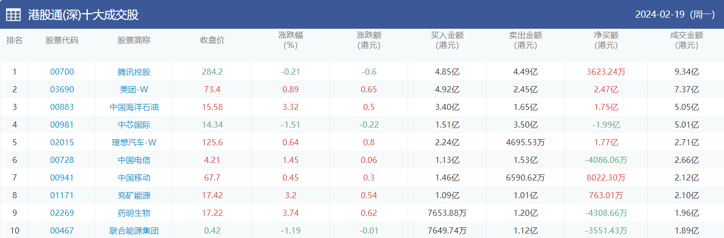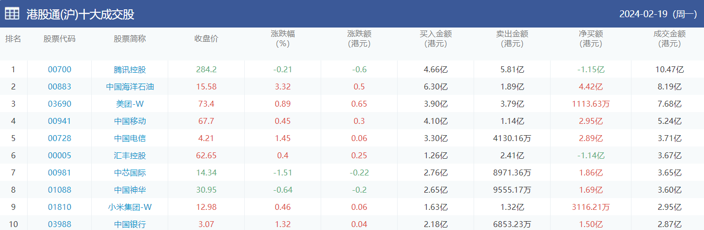 亚汇网实时数据统计:截至2月20日收盘腾讯控股、中国海洋石油、美团-w位居港股通(沪)成交前三,腾讯控股、美团-w、中国海洋石油位居股通(深)成交前三。