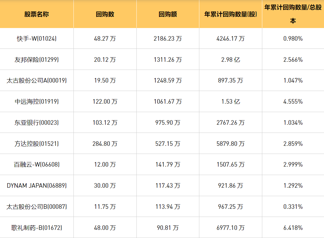 2月23日港股回购概况:DYNAM JAPAN(06889)、微泰医疗-B(02235)、友和集团(02347)、歌礼制药-B(01672)、东亚银行(00023)、百融云-W(06608)、中远海控(0)、民银资本(01141)、清科创业(01945)、首程控股(00697)、太古股份公司A(00019)、太古股份公司B(00087)、友邦保险(01299)、方达控股(01521)、快手-W(01024)于2024年2月22日进行了回购。其中,回购金额最大的为快手-W(01024),回购数量48.27 万,回购金额2186.23 万元。