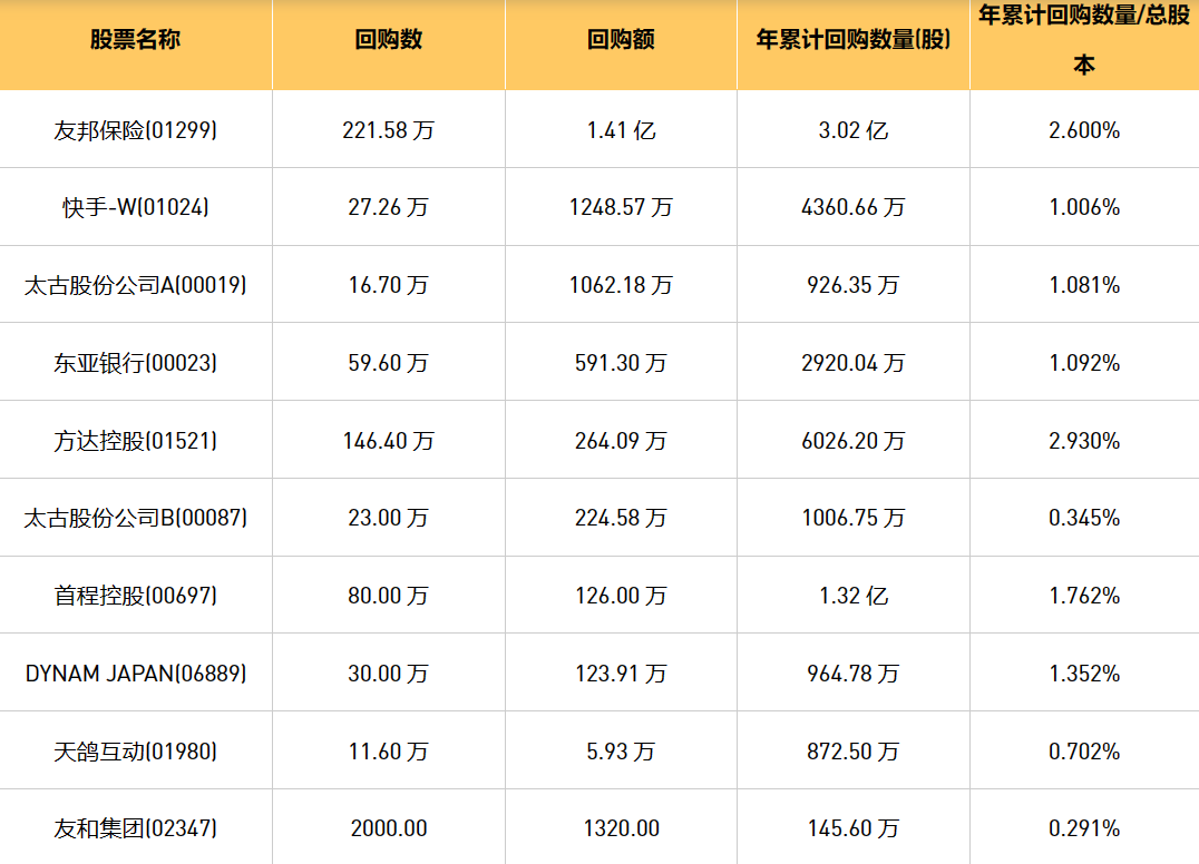 2月27日港股回购概况:DYNAM JAPAN(06889)、东亚银行(00023)、友和集团(02347)、首程控股(00697)、友邦保险(01299)、天鸽互动(01980)、方达控股(01521)、美亨实业(01897)、快手-W(01024)、太古股份公司A(00019)、乐声电子(00213)、太古股份公司B(00087)于2024年2月26日进行了回购。其中,回购金额最大的为友邦保险(01299),回购数量221.58 万,回购金额1.41 亿元。