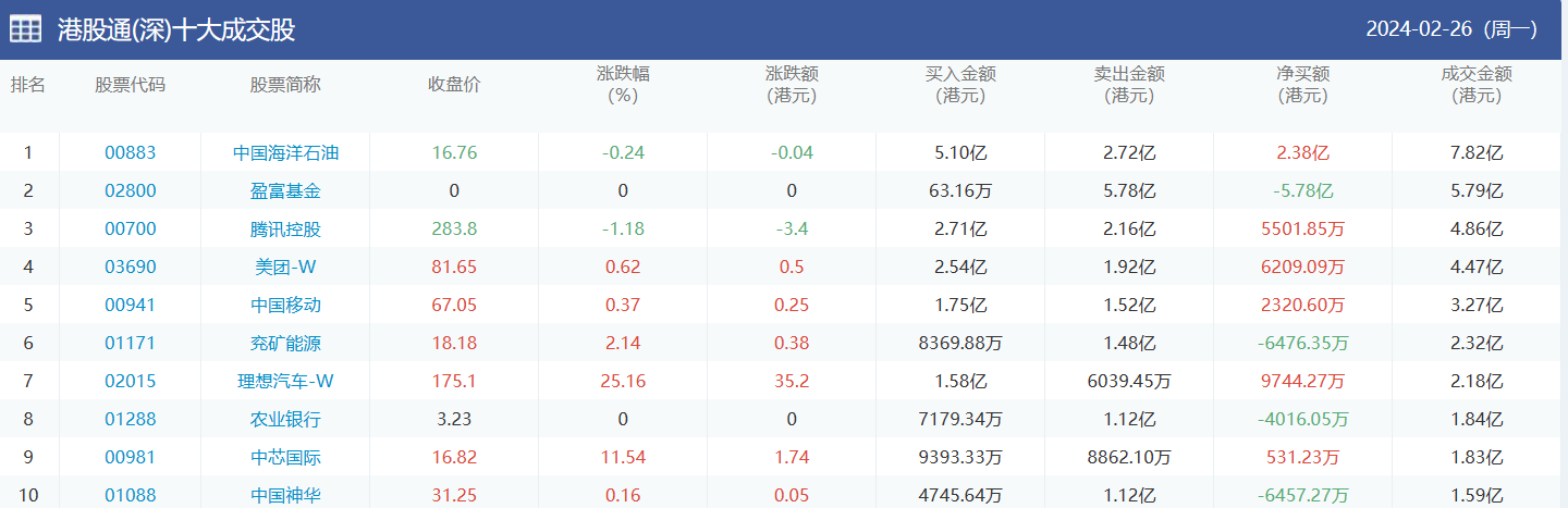 亚汇网实时数据统计:截至2月27日收盘中国海洋石油、腾讯控股、建设银行位居港股通(沪)成交前三,中国海洋石油、盈富基金、腾讯控股位居股通(深)成交前三。