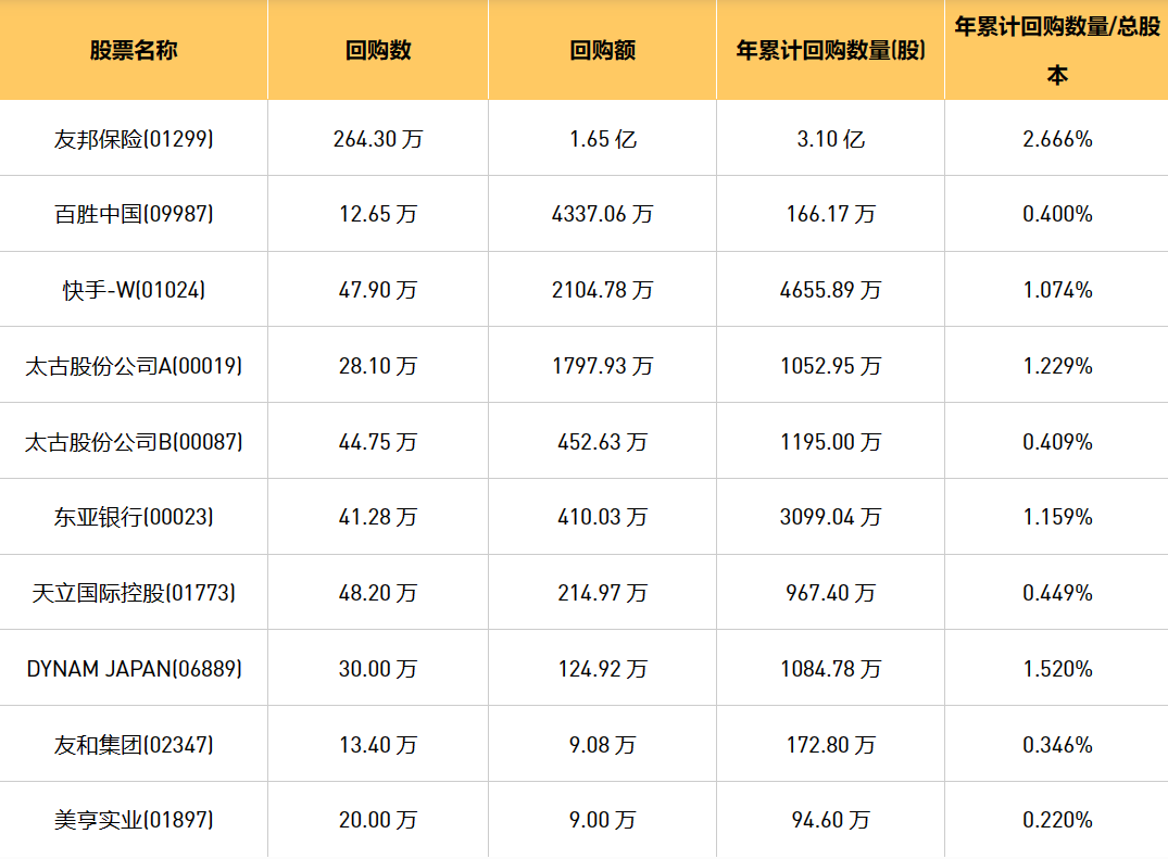 今日港股最新回购股份公司一览(2024/3/4)