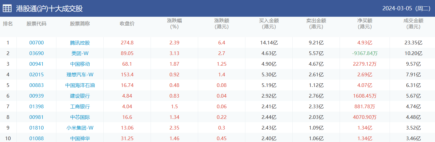 亚汇网实时数据统计:截至3月6日收盘腾讯控股、美团-w、中国移动位居港股通(沪)成交前三,腾讯控股、美团-w、中国移动位居股通(深)成交前三。
