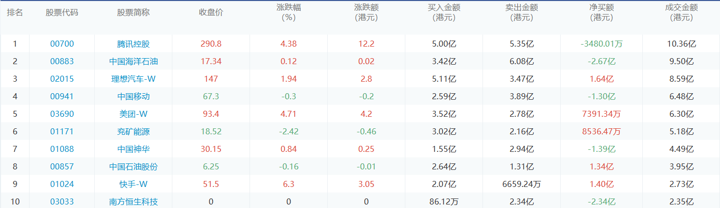 亚汇网3月12日港股通数据统计显示:腾讯控股净买入额居首,达5.00亿港元,中国海洋石油净卖出额居第一位。