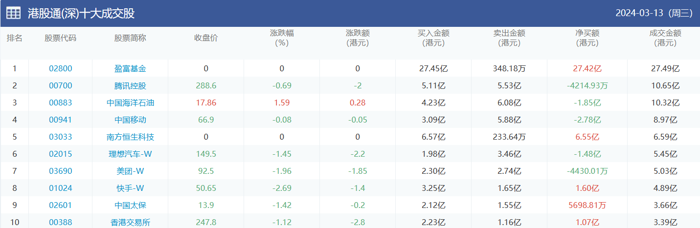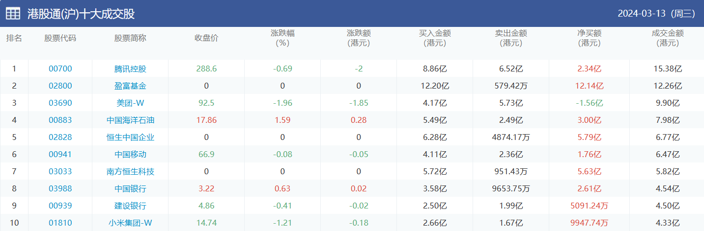 亚汇网实时数据统计:截至3月14日收盘腾讯控股、盈富基金、美团-w位居港股通(沪)成交前三,腾讯控股、盈富基金、中国海洋石油位居股通(深)成交前三。