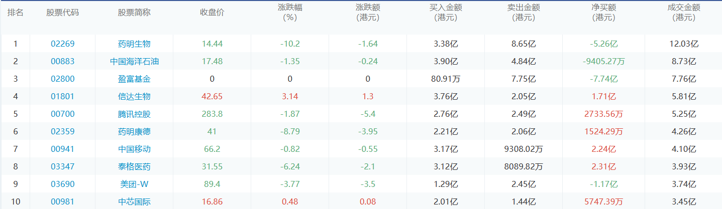 亚汇网3月15日港股通数据统计显示:中国海洋石油净买入额居首,达3.90亿港元,药明生物净卖出额居第一位。