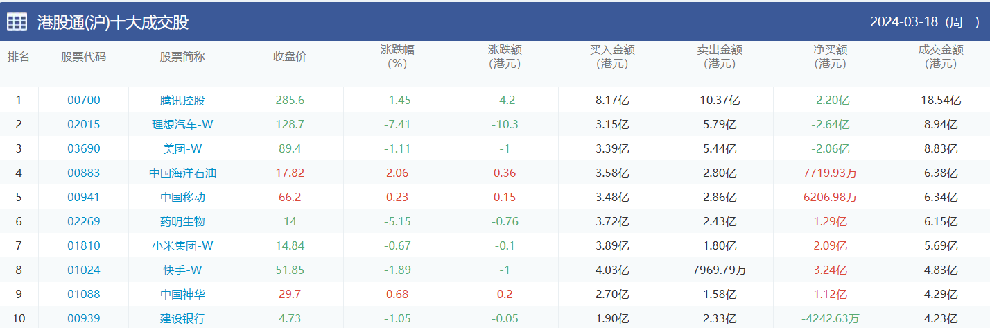 亚汇网实时数据统计:截至3月19日收盘腾讯控股、理想汽车-w、美团-w位居港股通(沪)成交前三,腾讯控股、药明生物、理想汽车-w位居股通(深)成交前三。