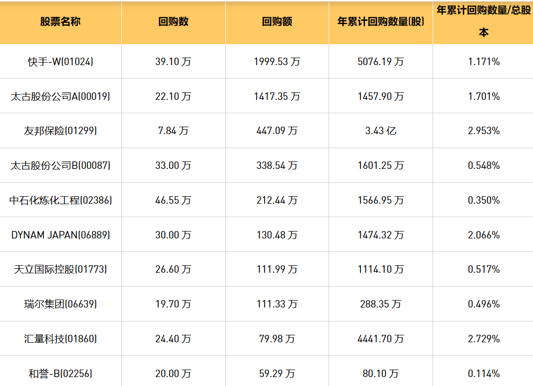 3月22日港股回购概况:科联系统(00046)、DYNAM JAPAN(06889)、友邦保险(01299)、天福(06868)、中石化炼化工程(02386)、太古股份公司A(00019)、美亨实业(01897)、彩客新能源(01986)、亿都(国际控股)(00259)、太古股份公司B(00087)、快手-W(01024)、汇量科技(01860)、瑞尔集团(06639)、和誉-B(02256)、天立国际控股(01773)于2024年3月21日进行了回购。其中,回购金额最大的为快手-W(01024),回购数量39.10 万,回购金额1999.53 万元。