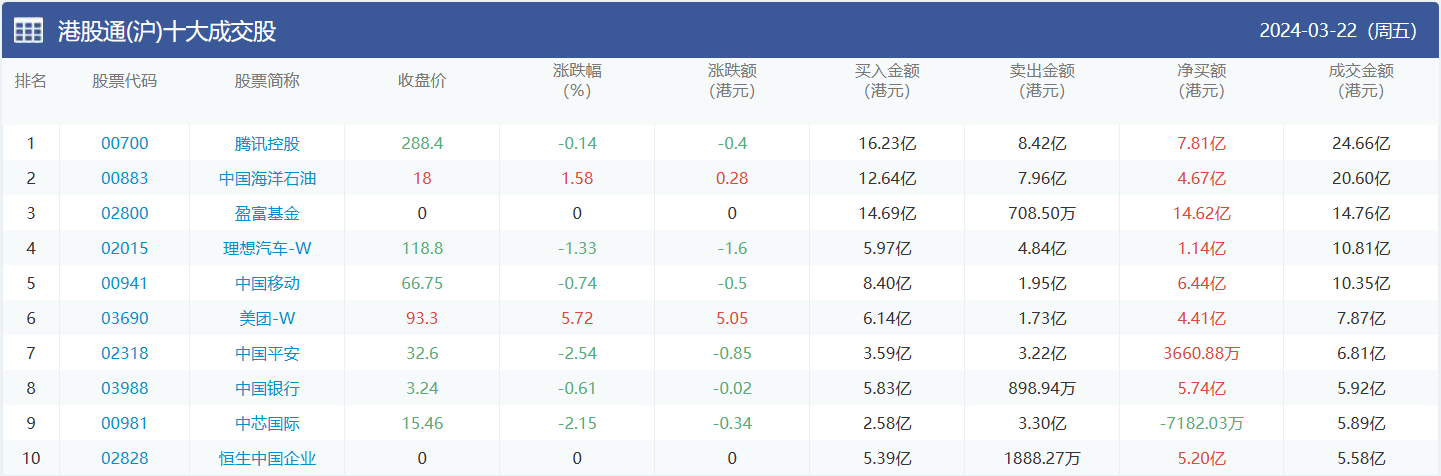 亚汇网实时数据统计:截至3月25日收盘腾讯控股、中国海洋石油、盈富基金位居港股通(沪)成交前三,盈富基金、中国海洋石油、腾讯控股位居股通(深)成交前三。