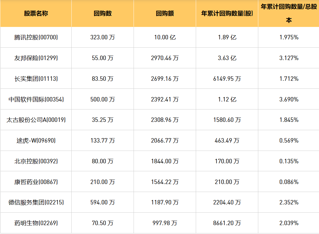 今日港股最新回购股份公司一览(2024/4/3)