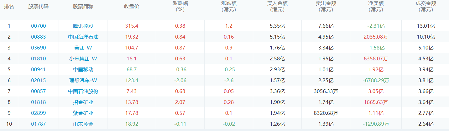 亚汇网4月11日港股通数据统计显示:腾讯控股净买入额居首,达5.35亿港元,腾讯控股净卖出额居第一位。