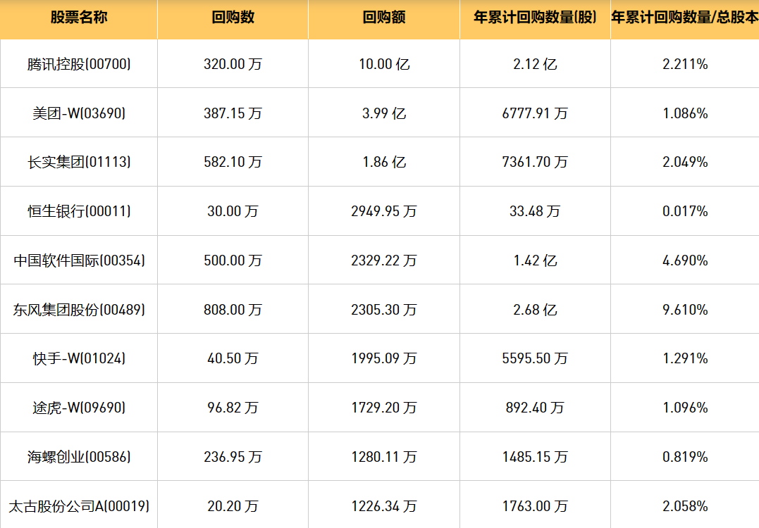 4月15日港股回购概况:旭辉永升服务(01995)、永安国际(00289)、中国软件国际(00354)、腾讯控股(00700)、三生制药(01530)、东风集团股份(00489)、东亚银行(00023)、百宏实业(02299)、九方财富(09636)、亿都(国际控股)(00259)、天福(06868)、信星集团(01170)、京信通信(02342)、创维集团(00751)、联易融科技-W(09959)、清科创业(01945)、首程控股(00697)、天工国际(00826)、固生堂(02273)、百融云-W(06608)、中石化炼化工程(02386)、海螺创业(00586)、太古股份公司A(00019)、友和集团(02347)、周黑鸭(01458)、旭日企业(00393)、万物云(02602)、天鸽互动(01980)、雍禾医疗(02279)、先声药业(02096)、恒生银行(00011)、友邦保险(01299)、太古股份公司B(00087)、盛业(06069)、长实集团(01113)、康哲药业(00867)、途虎-W(09690)、医渡科技(02158)、中手游(00302)、快手-W(01024)、康圣环球(09960)、瑞尔集团(06639)、和誉-B(02256)、永达汽车(03669)、协合新能源(00182)、美团-W(03690)、顺丰同城(09699)、百胜中国(09987)于2024年4月12日进行了回购。其中,回购金额最大的为腾讯控股(00700),回购数量320.00 万,回购金额10.00 亿元。