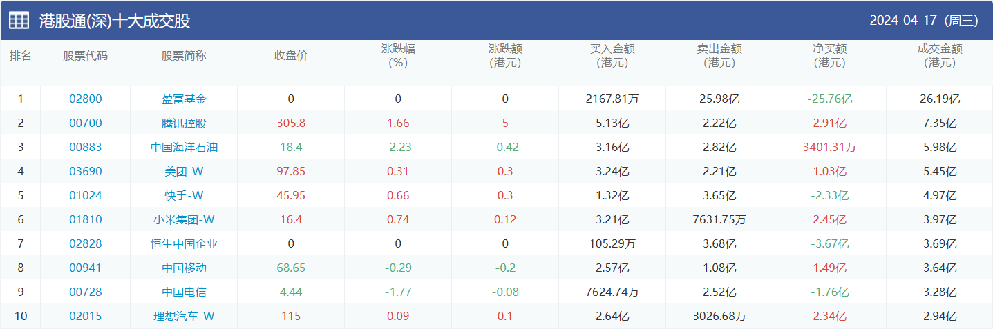亚汇网实时数据统计:截至4月18日收盘盈富基金、腾讯控股、中国移动位居港股通(沪)成交前三,盈富基金、腾讯控股、中国海洋石油居股通(深)成交前三。