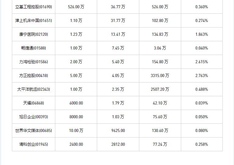 方正控股(00418)、信利国际(00732)、天福(06868)、卡罗特(N24025)、津上机床中国(01651)、力鸿检验(01586)、希玛眼科(03309)、太平洋航运(02343)、中旭未来(09890)、蒙牛乳业(02319)、中集集团(02039)、酷派集团(02369)、旭日企业(00393)、世界华文媒体(00685)、归创