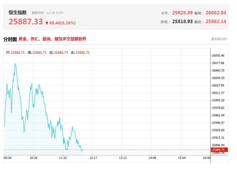 上午盘面:2025年步入尾声,港股本周只开市3天半,恒指今早高开109点报25928点,迅速突破两万六关口,一度最多升264点高见26082后回顺,重返50日线。截至收盘,恒指早盘收涨0.26%,科指早盘收涨1.6%,恒指大市成交额1264亿港元。盘面上,汽车股一骑绝尘领涨大市,医疗设备、有色金属、纸业、航空股大涨,游戏软件、旅游观光股反弹,半导体股再度走强;服装零售、电讯设备、教育股震荡下挫,化妆品、医美概念、重型机械股回调。个股方面,微创机器人(02252.HK)涨超30%,蔚来汽车(09866.HK)、小鹏汽车(09868.HK)、比亚迪股份(01211.HK)均涨超6%,网易(09999.HK)、美团(03690.HK)、泡泡玛特(09992.HK)均涨超2%;长和(00001.HK)跌超3%,华润电力(00836.HK)、银河娱乐(00027.HK)均跌超2%。(金十数据APP)