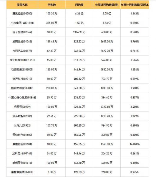 摩比发展(00947)、石四药集团(02005)、方正控股(00418)、吉利汽车(00175)、绿城服务(02869)、百宏实业(02299)、信利国际(00732)、富智康集团(02038)、滨海投资(02886)、天福(06868)、宝胜国际(03813)、腾讯控股(00700)、VITASOY INT'L(00345)、威高股份(01066)、瑞声科技(02018)、津上机床中国(01651)、加科思-B(01167)、中视金桥(00623)、小米集团-W(01810)、易点云(02416)、永升服务(01995)、同方友友(01868)、明源云(00909)、金风科技(02208)、周黑鸭(01458)、联易融科技-W(09959)、思派健康(00314)、天伦燃气(01600)、融创服务(01516)、叮当健康(09886)、名创优品(09896)、东阳光药(06887)、多点数智(02586)、巨子生物(02367)、德康农牧(02419)、美亨实业(01897)、九毛九(09922)、北森控股(09669)、手回集团(02621)、捷利交易宝(08017)、中国心连心化肥(01866)、连连数字(02598)、绿茶集团(06831)、骏杰集团控股(08188)、朝聚眼科(02219)、KEEP(03650)、康臣药业(01681)、家乡互动(03798)、天立国际控股(01773)、荃信生物-B(02509)于2026年1月6日进行了回购。其中,回购金额最大的为腾讯控股(00700),回购数量100.30 万,回购金额6.36 亿元。