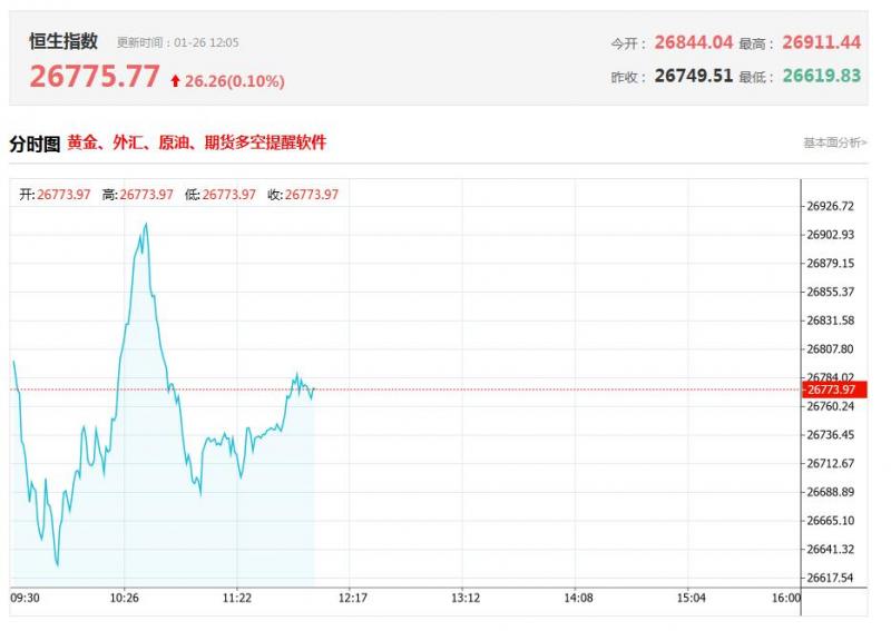 港股上午盘恒指、国指盘中冲高,恒生指数午间收涨0.09%,国企指数跌0.09%,恒生科技指数表现较弱,最终下跌1.31%。权重技股多数出现下跌行情,尤其是百度跌近4%,小米跌超2%,阿里巴巴跌超1%;地缘政治影响+美元走低,金银价格持续爆发创新高,黄金带领有色金属股上涨,灵宝黄金、山东黄金、紫金黄金国际等多股持续创新高价,另外铜业股中国有色矿业亦大涨超11%。另外,军工股、半导体股、苹果概念股跌幅明显。